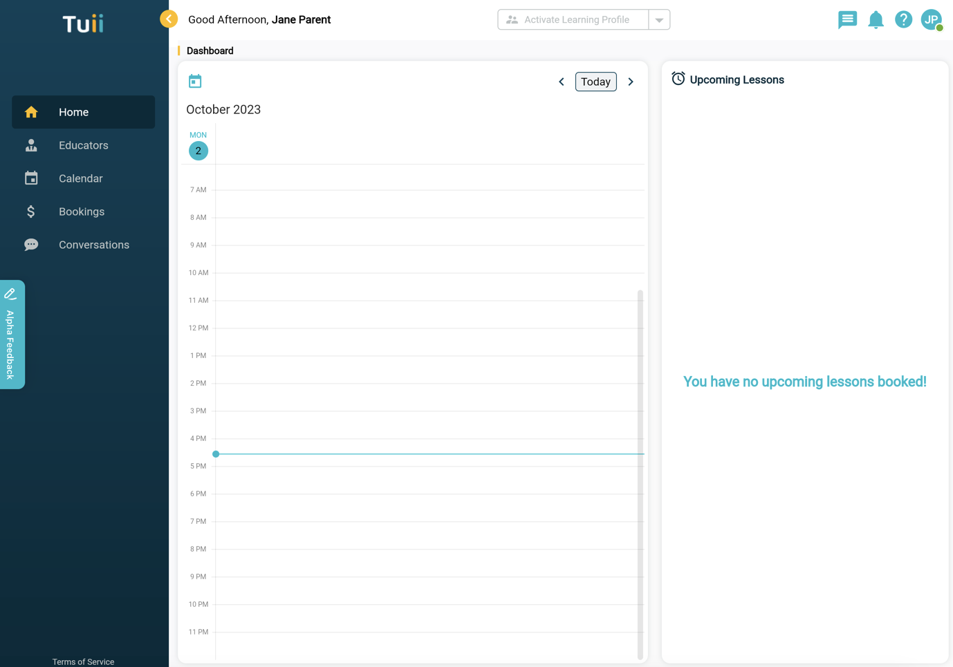 You will notice at the top of the screen “Activate Learning Profile”. This is where you change between the Parent User and the Child User. The child has no access to payments or bookings when their learning profile is activated.