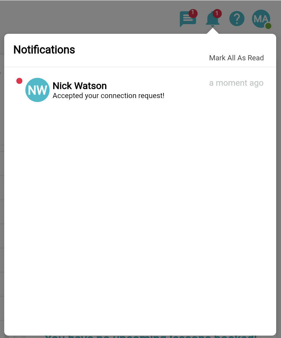 Once your educator accepts your connection request you will be able to accept and pay for Bookings and receive your first Lesson. You'll get a notification from your educator once they accept your connection request.