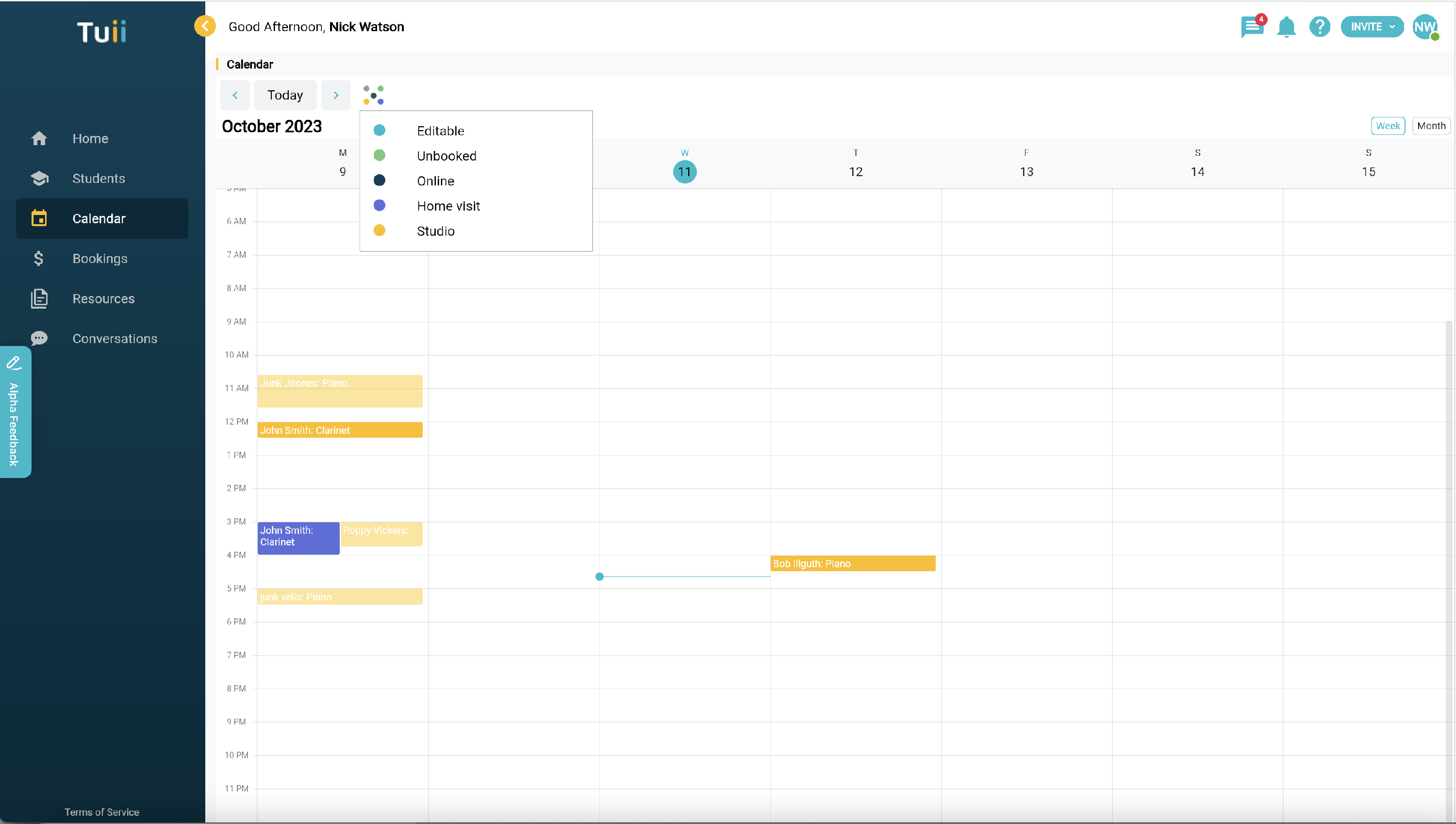 Each type of delivery method (Studio, Home Visit & Virtual) has a specific colour. You can see these colours by clicking the legend at the top of the calendar.